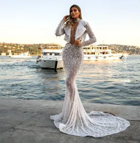 Simply elegant! This sleek gown screams glam from head to toe. The form-fitting shape will be sure to highlight your curves while the crystal-beaded top brightens up the gown. Turn around and you'll find the beauty doesn't end there, the crystal back-drop and train completes the look you're looking for.
